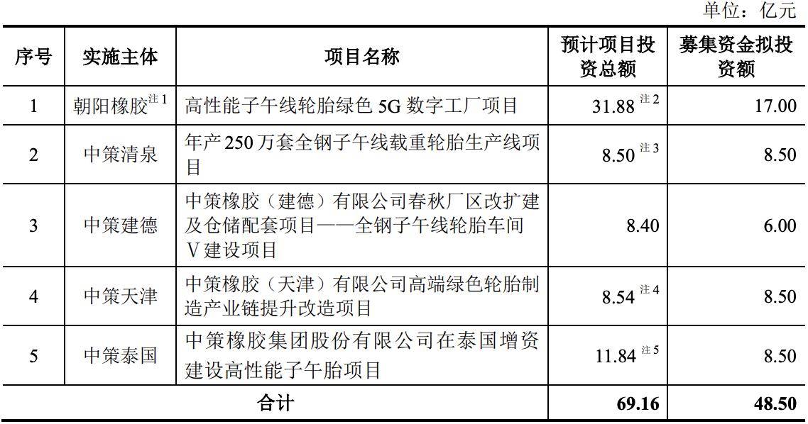 与此同时,原投入1.5亿元的“研发项目升级及信息化建设技术改造项目”和28.5亿元的“补充流动资金”均被删除。相比之下,中策橡胶增加了“在泰国增资建设高性能子午胎项目”,该项目拟投入募资金额8.5亿元。