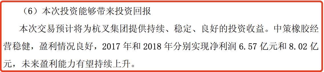 另外,本次投资能够带来投资回报。杭叉集团认为,本次交易预计将为杭叉集团提供持续、稳定、良好的投资收益。其中,中策橡胶2017年和2018年分别实现净利润6.57亿元和8.02亿元。