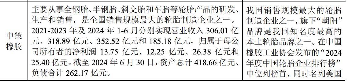 2021年、2022年、2023年度和2024年上半年,中策橡胶的营收分别约306.01亿元、318.89亿元、352.52亿元和185.18亿元,净利润分别约13.75亿元、12.25亿元、26.38亿元和25.40亿元,扣非后净利润分别约12.92亿元、10.81亿元、24.98亿元和21.44亿元。