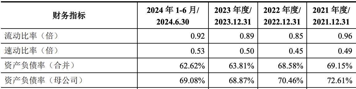 报告期内(2021年度至2024年上半年),中策橡胶的资产负债率(母公司)分别为72.61%、70.46%、68.87%和69.08%,资产负债率(合并)分别为69.15%、68.58%、63.81%和62.62%,流动比率分别为0.96、0.85、0.89和0.92。