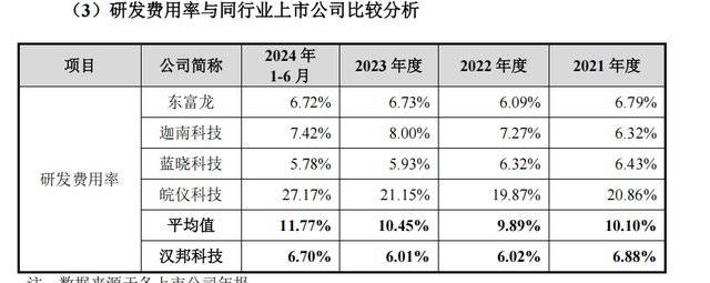 在研发方面,汉邦科技的研发费用分别为2204万元、2899万元、3718万元和2204万元,对应的研发费用率分别为6.88%、6.02%、6.01%和6.70%。尽管公司的研发投入呈增长趋势,但其研发费用率依然低于同行业可比公司平均值,报告期内,同行上市公司的平均值在约10%以上。