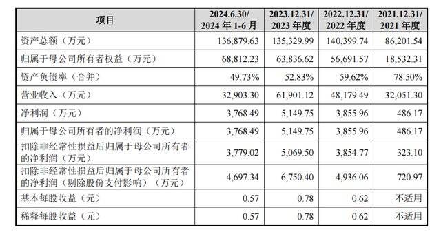 财务方面,2021年至2024年1月-6月( 简称报告期内),汉邦科技分别实现营业收入3.21亿元、4.82亿元、6.19亿元、3.29亿元,同期实现归母净利润分别为486万、3855万、5149万、3768万。