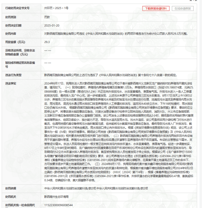 今年1月20日,黔西南双胞胎猪业有限公司因环境违法行为被黔西南州生态环境局处以29.3万元的罚款。