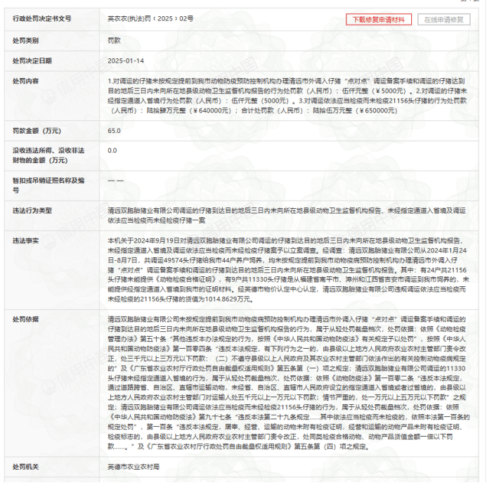 信用中国数据显示,今年1月14日,英德市农业农村局对双胞胎集团旗下子公司清远双胞胎猪业有限公司开出65万元的罚单。