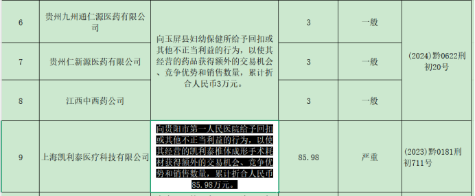 据该中心发布的公告显示,凯利泰医疗因“向贵阳市第一人民医院给予回扣或其他不正当利益的行为,以使其经营的凯利泰椎体成形手术耗材获得额外的交易机会、竞争优势和销售数量,累计折合人民币85.98万元。”,被认定为“严重”失信企业。对于此类企业,该省将限制该类企业涉案药品或医用耗材挂网、投标及配送资格,限制期至2028年3月31日。