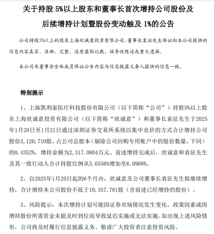 1月22日,凯利泰医疗发布公告称,自1月20日起的6个月内,公司董事长袁征及袁征持股87.59%的欣诚意拟合计增持公司股份不低于1035.78万股。1月20日至1月21日期间,两者已经斥资2317万元增持312.07万股股份。