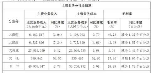 2024年上半年,白云山大南药、大健康、大商业板块的毛利率均出现下滑。特别是大健康板块营业收入65.38亿元,同比下滑7.24%,在公司总收入中占比约16%。