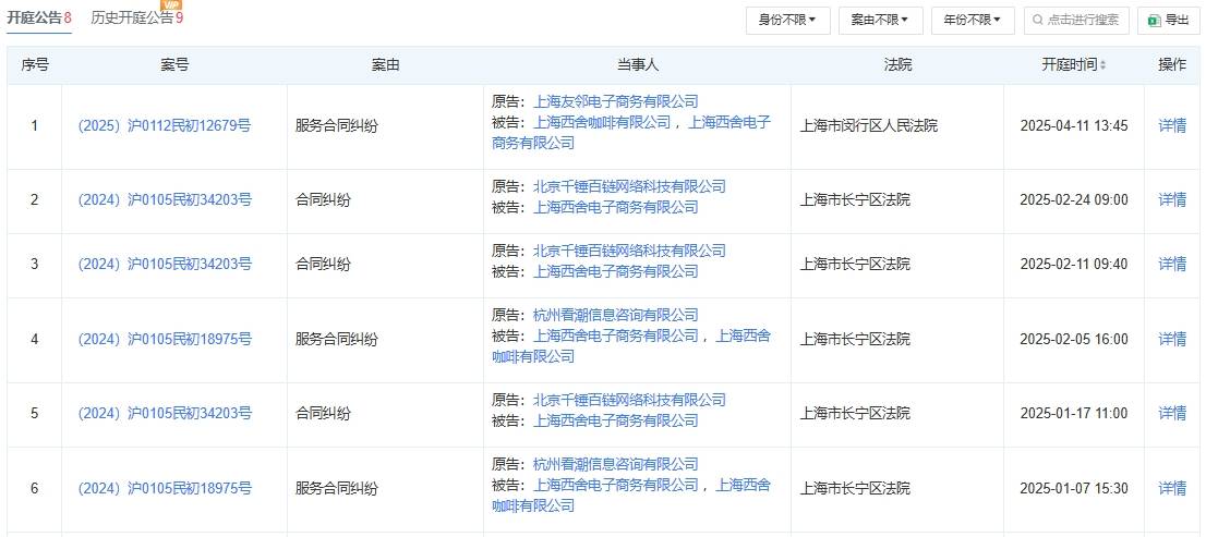 天眼查显示,2024年7月至11月间,与Seesaw相关的多起涉及买卖合同纠纷的法律案件一直在陆续开庭审理中。今年以来,上海西舍新增6条开庭信息。