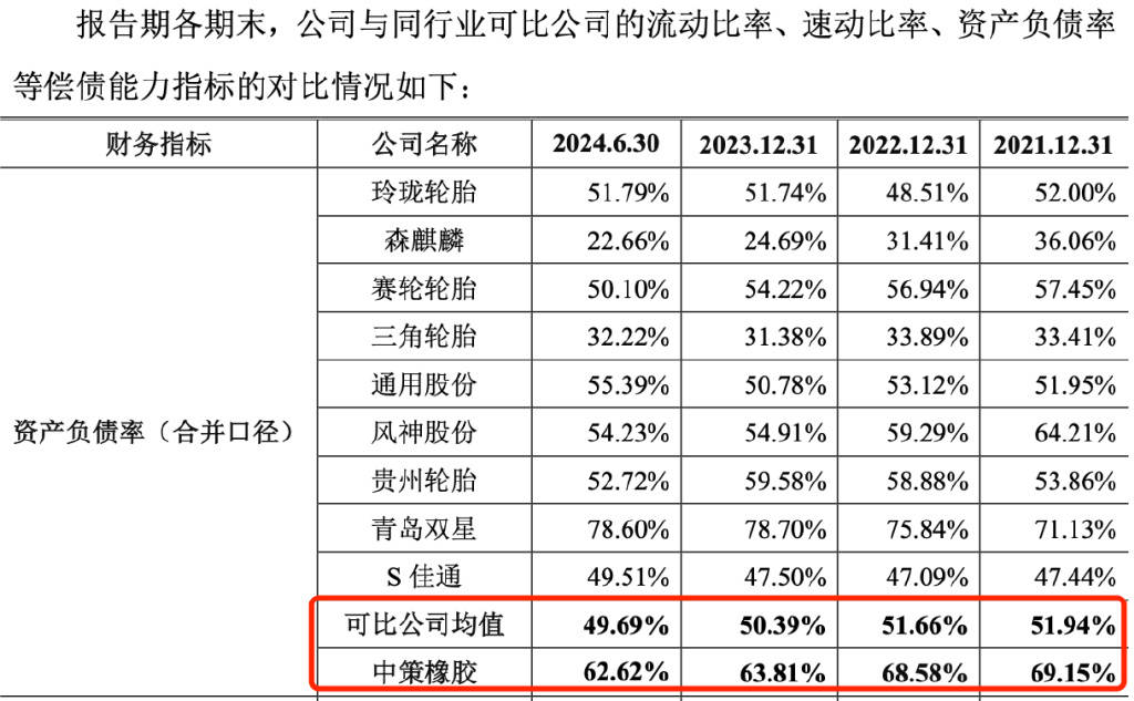 招股书显示,2021年至2024年上半年,中策橡胶的资产负债率分别为69.15%、68.58%、63.81%和62.62%。
