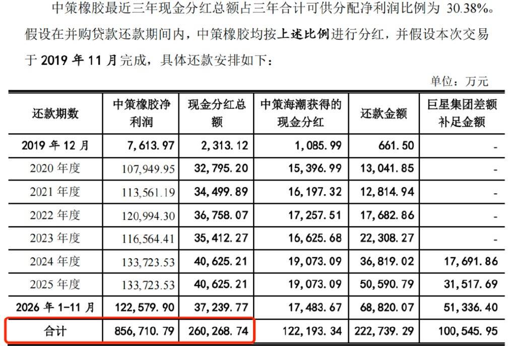巨星科技于2019年6月披露的公告显示,针对这部分并购贷款,中策海潮计划以中策橡胶未来分红来偿还,如现金分红无法覆盖还款本息,中策海潮将确保巨星集团履行承诺,以无偿借款形式履行补足责任。