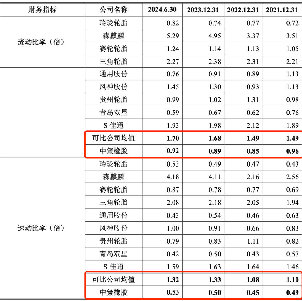 放在行业中来看,也可窥得中策橡胶面临的压力。招股书显示,中策橡胶的流动比率分别为0.96倍、0.85倍、0.89倍和0.92倍,速动比率分别为0.49倍、0.45倍、0.50倍和0.53倍,均低于同行可比公司均值。