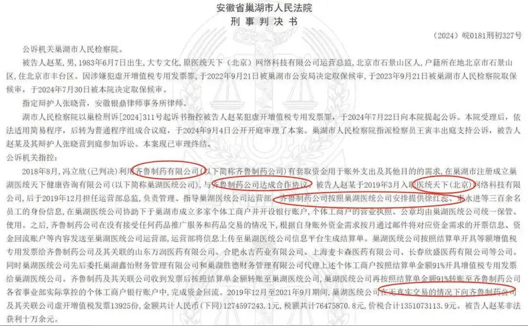 2019年12月至2021年9月期间,在无真实业务往来的情况下,巢湖医统天下向齐鲁制药虚开大量增值税专用发票, 价税合计13.5亿元 。据裁判文书披露,赵某非法获利十余万元,最终被判处有期徒刑三年缓刑三年,并处罚金5万元。