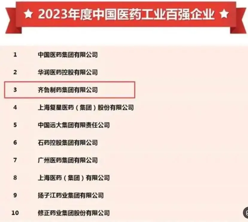 齐鲁制药做得很大,2023年度实现销售收入389.6亿元,位列2023年度中国医药工业百强企业榜第三名,排名超过复星医药。
