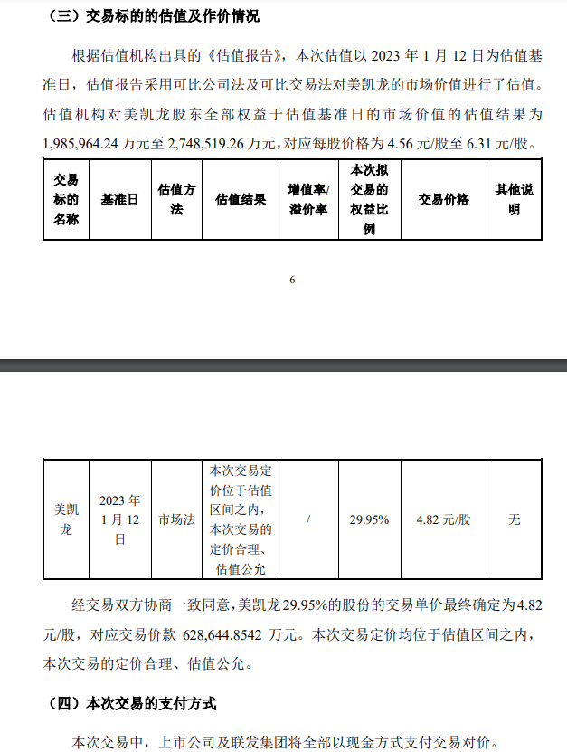 2023年建发股份发布公告称以62.86亿元的对价,买下红星美凯龙家居集团股份有限公司(以下简称美凯龙)29.95%的股权,成为后者的第一大股东兼实控人,折合每股4.82元,定价的估值方法用的是市场法,基准是美凯龙股东全部权益的市场价值估值。