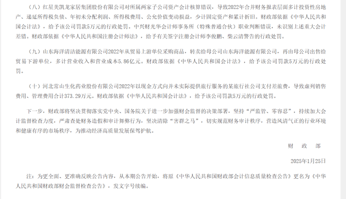 据财政部监督评价局1月25日发布的公告显示,2023年,财政部认真履行财会监督主责,依据《会计法》、《注册会计师法》等法律法规,组织有关监管局,对41家备案从事证券服务业务的会计师事务所开展执业质量检查,并延伸检查89户企业的会计信息质量。并通报了相关典型的违规案例和处罚信息,其中就有涉及到红星美凯龙家居集团股份有限公司的部分。