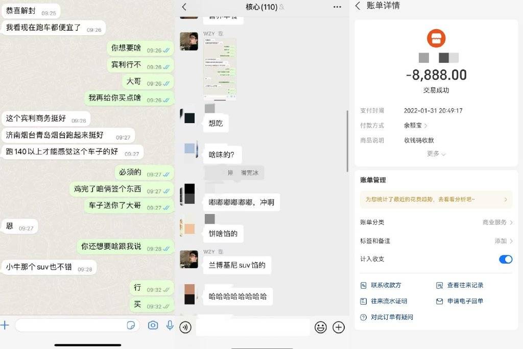 值得注意的是,王政源关于股票的消息大多来自一个“大哥”,王政源称这个“大哥”是上市公司的内部人员。刘峰说,有一次,王政源说要给这位大哥送豪车,需要群友分摊,大家给王政源转账8888元,刘峰和徐一诺也转了。