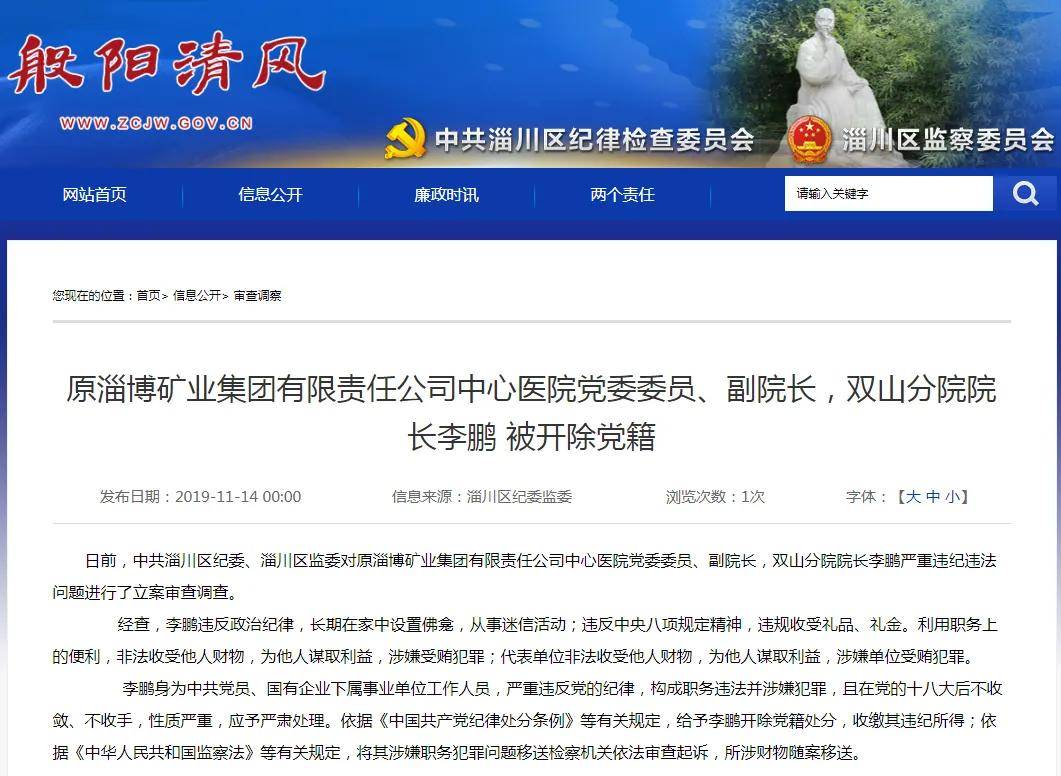 2019年11月,淄川区纪委监委网站发布消息,原淄博矿业集团有限责任公司中心医院党委委员、副院长,双山分院院长李鹏被开除党籍。李鹏利用职务便利,非法收受他人财物,为他人谋取利益,涉嫌受贿犯罪。
