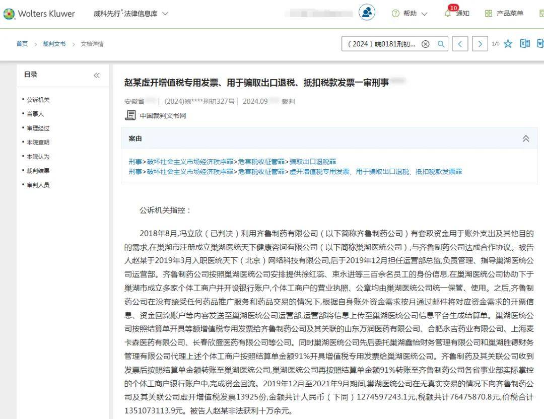 齐鲁制药旗下子公司的违规行为同样令人震惊。2012年10月至2015年7月期间,淄矿中心医院原副院长李鹏收受了齐鲁万和医药营销公司(以下简称“万和医药”)市场推广员夏某给予的回扣,金额高达39.56万元。然而,相关判决书已无法在中国裁判文书网上查询。这种“消失”现象值得深思。此外,齐鲁制药的子公司齐和医药还存在偷税行为,金额高达2,289.73万元。