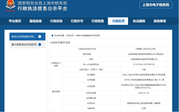 今天,作者想说的是另一家医药企业上海信谊联合医药药材有限公司,该企业是国企上市公司上海医药的全资子公司,就在今年1月份刚被上海市税务局第二稽查局以”让他人为自己虚开增值税发票的行为“处以62.56万元的罚款。