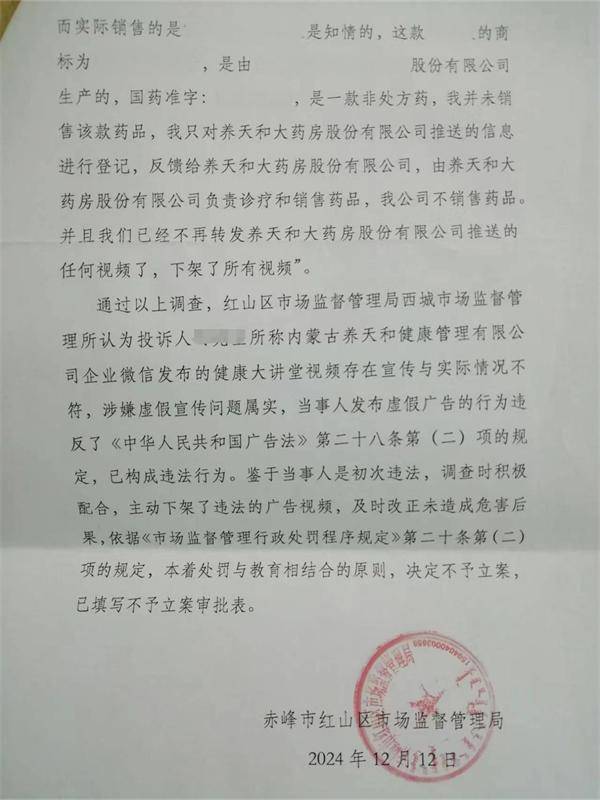 回复函提到:“通过调查,红山区市场监督管理局西城市场监督管理所认为投诉人所称内蒙古养天和健康管理有限公司企业微信发布的“健康大讲堂”视频存在宣传与实际情况不符,涉嫌虚假宣传问题属实,当事人发布虚假广告的行为违反了《中华人民共和国广告法》第二十八条第(二)项的规定,已构成违法行为。鉴于当事人是初次违法,调查时积极配合,主动下架了违法的广告视频,及时改正未造成危害后果,依据《市场监督管理行政处罚程序规定》第二十条第(二)项的规定,本着处罚与教育相结合的原则,决定不予立案,已填写不予立案审批表。”