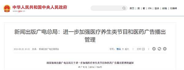 记者从市场监督管理部门了解到,国家新闻出版广电总局高度重视医疗养生类节目和医药广告播出的管理。2016年出台的《国家新闻出版广电总局关于进一步加强医疗养生类节目和医药广告播出管理的通知》新广电发〔2016〕156号文件明确指出: