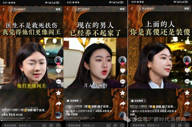 媒体查看多个账号高频次发布的视频发现,内容主要有三大类别。首先是一些“医生不是救死扶伤”“现在男人养不起家了”“上面的人你是真傻还是装傻”“两袖清风做不了官”等话题,煽动群众负面情绪。这些视频中,大多涉及社会敏感话题,容易与底层百姓产生共鸣,点赞和关注度较较高,能博取更多网络流量。