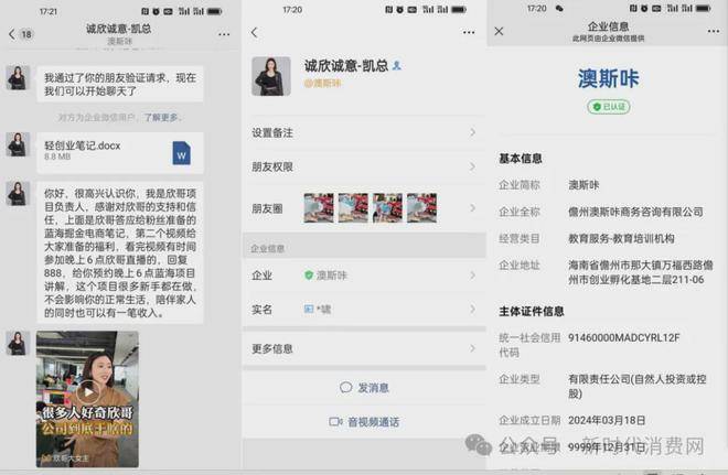 2024年11月份以来,媒体通过上述短视频账号分别添加了“欣哥”多个微信,当媒体添加完成后,对方就立即发来所谓的“轻创业笔记”和“欣哥”出镜拍摄自己创业项目的视频。