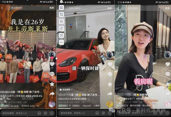 其次是一些是她短时间内逆袭暴富,买劳斯莱斯、保时捷等豪车、选购房产,徒弟买豪车,豪华办公环境以及过奢靡生活的视频。这些视频无形中显露自己的财富,在多个账号上反复进行炫耀,打造成功人士形象,让普通网民对其从事的工作充满好奇,吸引更多人关注。