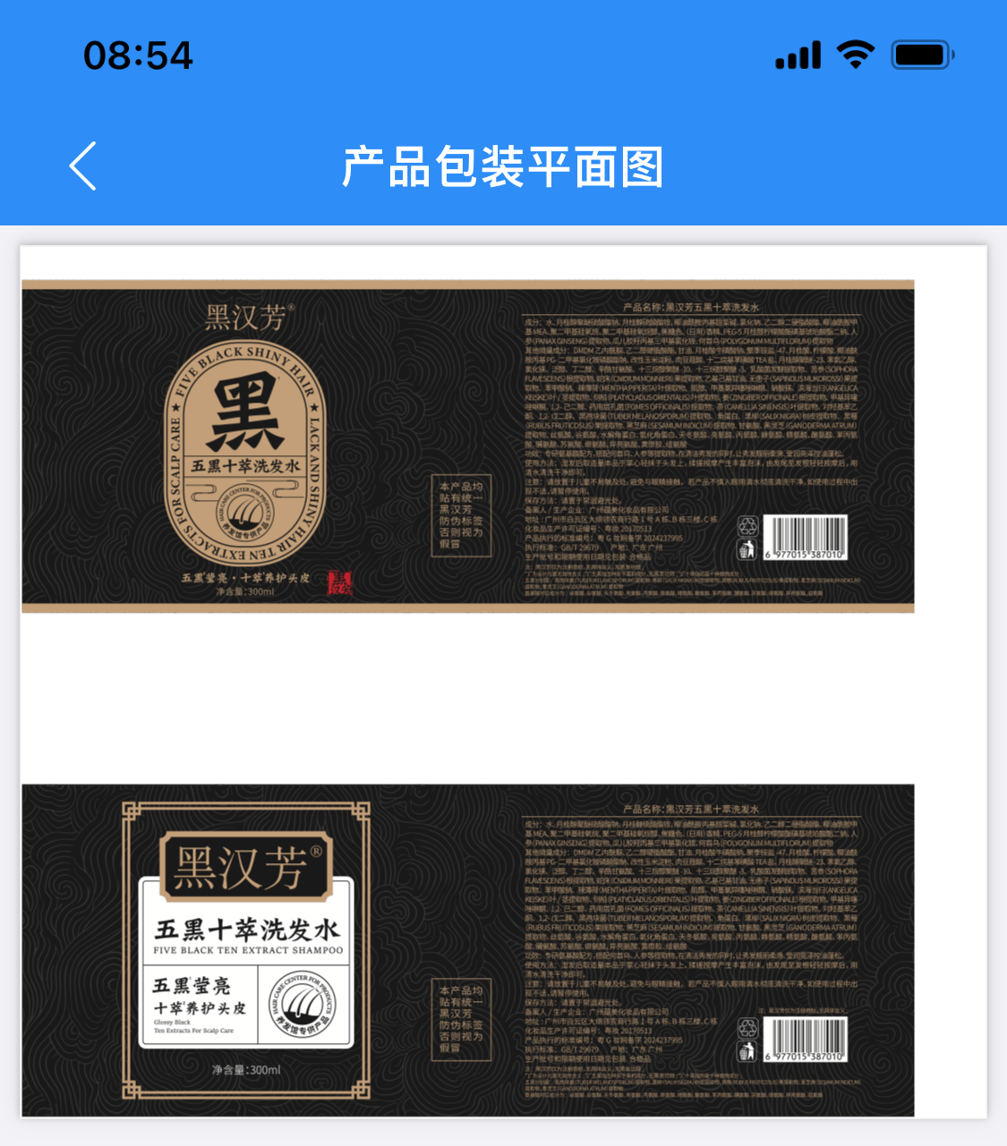 记者通过国家药监局化妆品监管APP查询到这款产品的备案资料,该产品并非特殊用途化妆品,而是国产普通化妆品。记者在该产品包装平面图上看到,产品下方的备注内容明确“黑汉芳仅为注册商标,无具体含义,无黑发功效”“‘黑’为设计元素无其他含义”“‘五黑’指五种关于黑的成分,无黑发功效”“十萃指的是十种植物成分”。