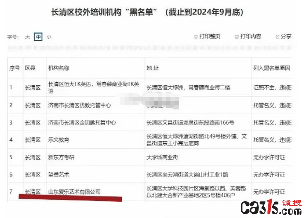 2月16日,滨州魏女士爆料称,女儿在滨州高新高级中学读书时被学校介绍参加山东爱乐艺术有限公司的集训。但经查询,该机构无办学资质且被济南市长清区列入黑名单。魏女士表示,爱乐艺术有限公司法人宋某琳以学校艺体部负责人名义招生,承诺集训在校内进行,不少家长因此缴纳了36800元培训费到学校公户。