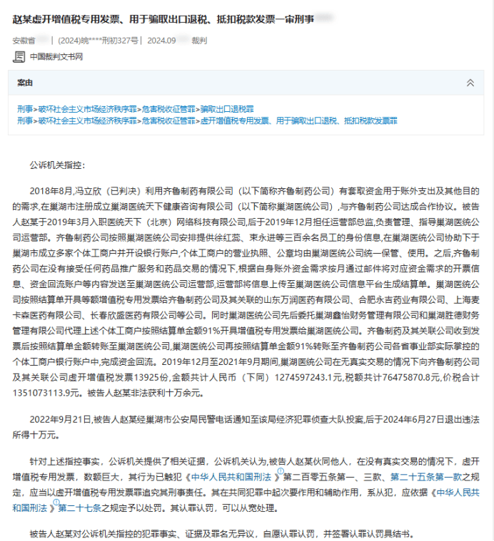 最终法院认定,2019年12月至2021年9月期间,巢湖医统天下健康咨询有限公司在“无真实交易”情况下,向齐鲁制药有限公司及其关联公司虚开增值税发票13925份,金额共计12.75亿元,税额共计7647.59万元,价税合计13.51亿元,被告人赵某非法获利十万余元。赵某构成虚开增值税专用发票罪,被判处有期徒刑三年、缓刑三年。