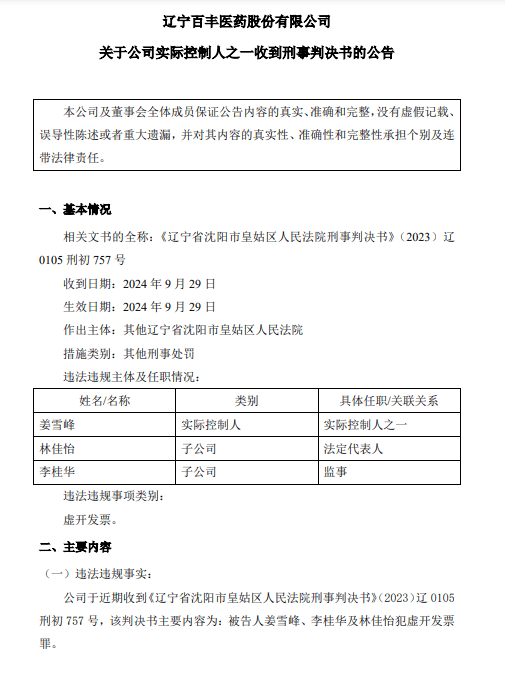 而在2024年10月份,已经有医药类的上市公司高管因涉及虚开发票罪被判刑。2024年10月8日,上市公司百丰医药发布公告称,公司实控人姜雪峰、法人代表林佳怡、监事李桂华等因犯虚开发票罪被判处10个月至6年不等刑期,并处以罚金。