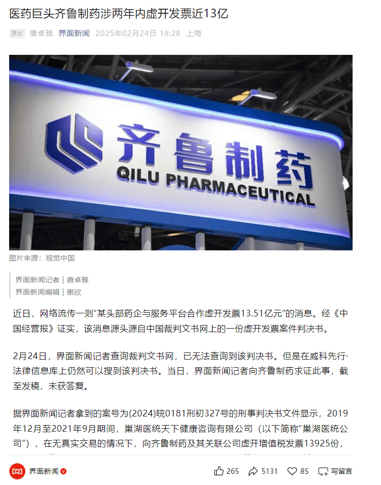 日前,上海报业集团界面新闻等多家官方媒体披露了一则安徽省巢湖市人民法院案号为〔2024〕皖0181刑初327号的刑事判决书,内容直指医药行业巨头齐鲁制药有限公司(以下简称齐鲁制药)。