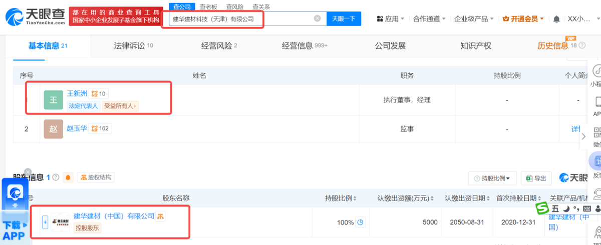 天眼查信息显示,建华建材科技(天津)有限公司由建华建材100%控股。
