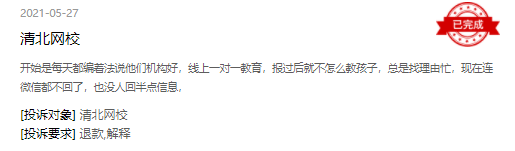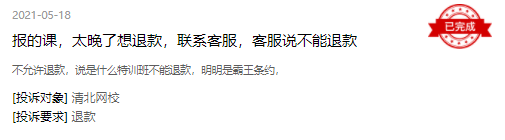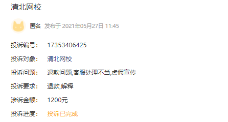 2021年5月27日,一消费者在黑猫投诉平台公开投诉,清北网校存在退款问题、客服处理不当、虚假宣传等问题,涉诉金额为1200元。