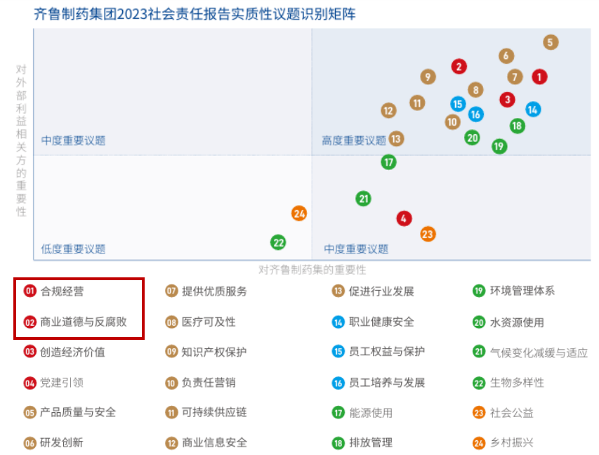 在公司治理议题方面,在齐鲁制药2023年及过往的社会责任报告中,“合规经营”“商业道德与反腐败”处于双重重要性矩阵的第一梯队,体现出公司对规范运营的重视。