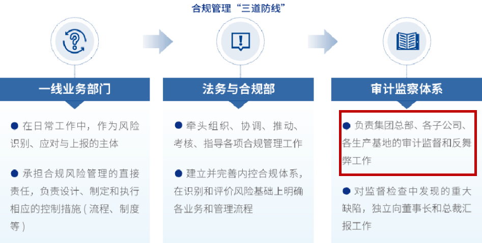 在风险管理设计上,齐鲁制药和众多公司一样,通过“业务部门—法务与合规部—审计监察体系”构建三道防线。其中业务部门作为第一道防线,承担合规风险的直接责任;法务与合规部负责完善内控体系,明确流程并识别风险。审计监察体系则独立监督,负责集团总部、各子公司、各生产基地的审计监督和反舞弊工作。