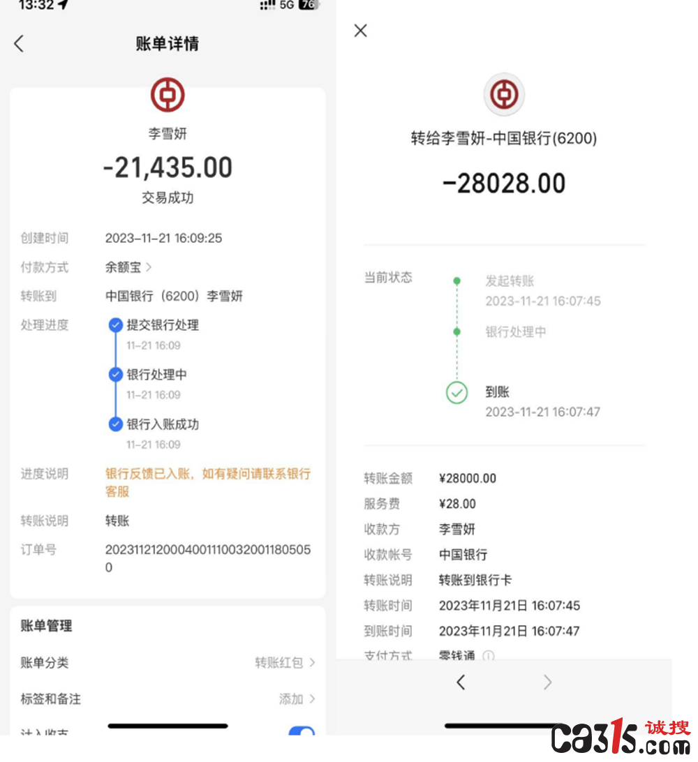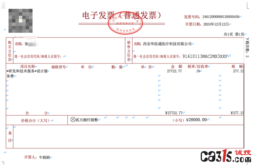除此之外,最值得一提的是,张女士还向315诚搜网透露,在她接受手术的前一天,医生要求她将治疗费用49435元转入到李姓主任医生助理“李雪妍”的个人银行账户内。对方告知她“李雪妍”先收取,再由“李雪妍”分两笔再汇入西安华医通医疗科技有限公司、西安兴通和医疗科技有限公司,为她开具收费明细分别为“计算机辅助费、导板费、3D打印模型”费用28000元;“预弯钛板/钛网、锯片”费用21435元。