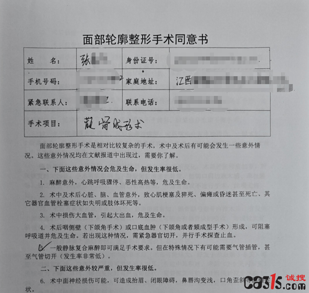 张女士告诉315诚搜网,后来她去过多家权威口腔医院,经过医生的诊断,认定原手术方案截骨设计不合理,才导致她的颤骨内推过多并损失大量骨块,生理机能遭受严重破坏。要想维护正常的生理机能,必须要采用取骼骨、颅骨外板或下颌骨植骨,再分期逬行颌面骨缺损修复重建术,以及假体恢复眶缘等,才能得以恢复。