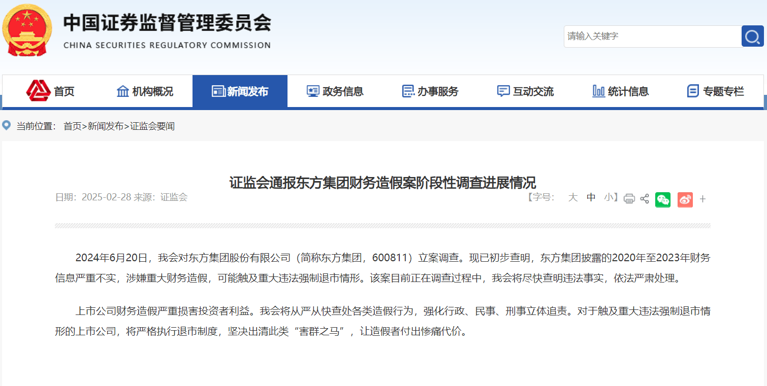 根据证监会2月28日的通报,披露了东方集团2020年-2023年财务信息严重不实,涉嫌重大财务造假,可能触及重大违法强制退市情形。该案目前正在调查过程中,证监会将尽快查明违法事实,依法严肃处理。