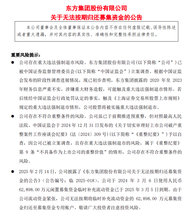 2024年3月,东方集团使用6.29亿元闲置募集资金临时补充流动资金,原定于2025年3月5日到期归还。