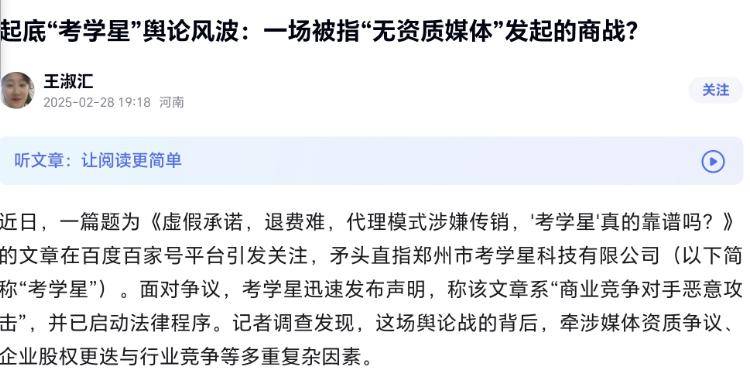 2月28日,互联网突然出现一篇账号名称为“王淑汇”,IP地址位于河南的自媒体文章。标题为“起底‘考学星’舆论风波:一场被指‘无资质媒体’发起的商战”?意在为“考学星”郑州公司“打气撑腰”。
