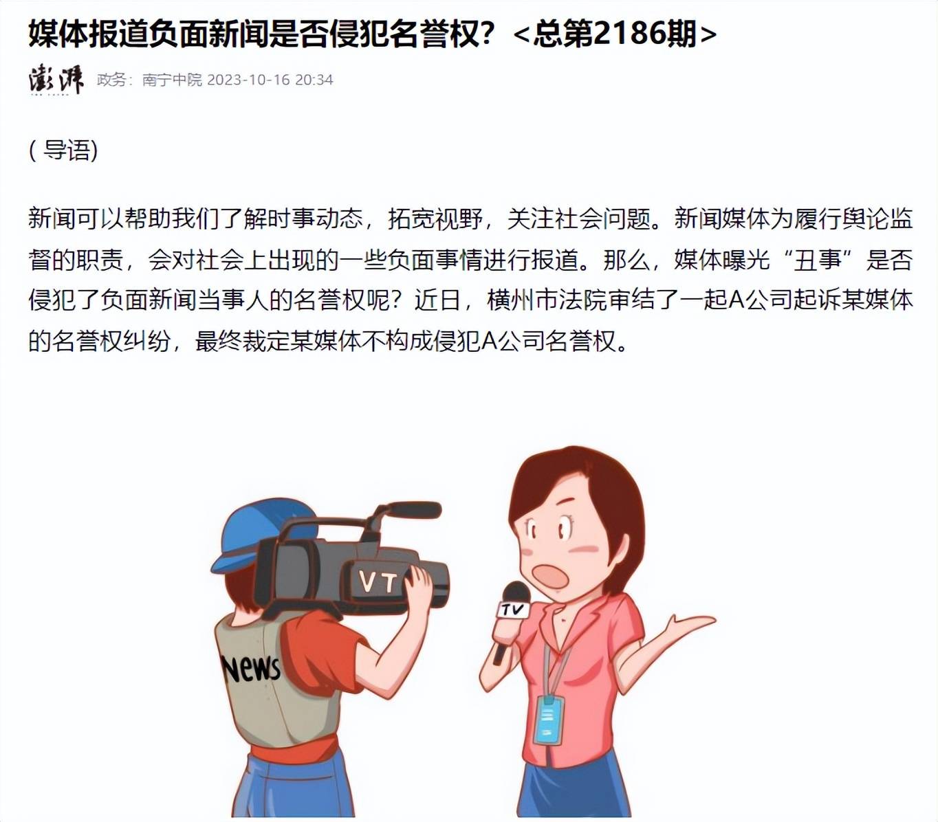 试问媒体爆料难道不是消费者维权的正规渠道?媒体报道负面新闻是否侵犯名誉权?在该篇自媒体文章中,作者煞有介事的披露:“涉事企业已对文章公证,将以‘损害商业信誉’为由起诉”。那么媒体报道负面新闻是否侵犯名誉权?澎湃新闻援引南宁中院的报道,媒体正当的新闻报道和舆论监督行为受法律保护。