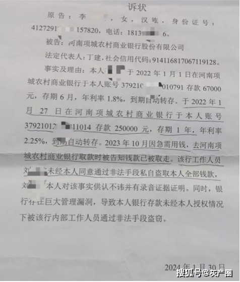 另据经视直播,5月14日,记者联系上了当事人李先生,他表示,2022年1月份,他的姐姐李女土来到周口市项城农村商业银行交通东路分理处存了两笔钱,一笔二十五万元,一笔六万七千元,当时都办的是定期。李先生说,2023年8月份,他和姐姐一起到银行取钱时,银行工作人员却表示,账户上已经没钱了,钱已被别人取走,李先生的姐姐当时就报了警。