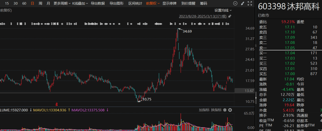 但是,沐邦高科的股价,却正是在修订以前的虚假业绩支撑下,从2024年8月15日的10.75元,在短短三个月中上涨至11月14日的34.69元,翻了两倍多。而期间的2024年8月27日,正是沐邦高科14亿定增解禁的时间点!