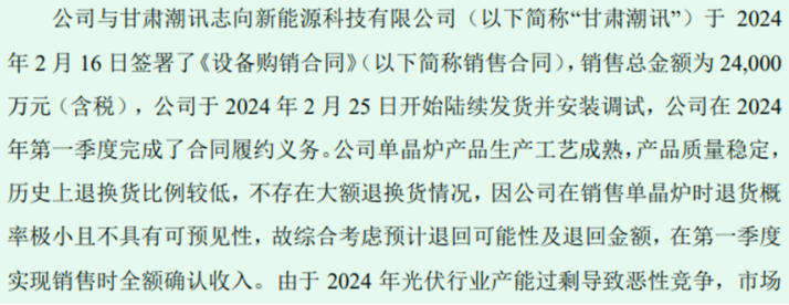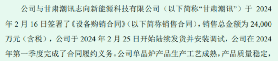 双方工作效果奇高——买单晶炉的甲方,在1个月左右的时间实现了安装调试、验货;卖单晶炉的乙方在2024年1季度,就完成了2.4亿合同的签约、履约、全额确认收入。