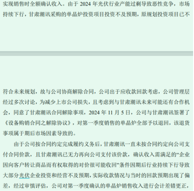 沐邦高科公告称:“由于 2024 年光伏行业产能过剩导致恶性竞争,市场 持续下行,甘肃潮讯采购的单晶炉投资项目投资不及预期,原规划投资项目已不符合未来规划,故与公司协商解除合同,公司出于应收款回款考虑,公司管理层经过多次讨论,为减少上市公司损失,且考虑到与甘肃潮讯未来可能还有合作机会,同意了甘肃潮讯合同解除事项,2024 年 11 月 5 日,公司与甘肃潮讯签署了 《设备购销合同之解除协议》,对第一季度销售的单晶炉全部予以退回,该退货 事项属于期后市场因素导致的。”
