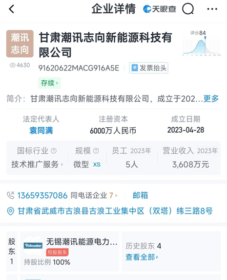 但就是对这个单晶炉客户破了例。这是一家小企业,全称是甘肃潮讯志向新能源科技有限公司(以下简称“甘肃潮讯”)。简单来看看这家公司的基本信息吧。