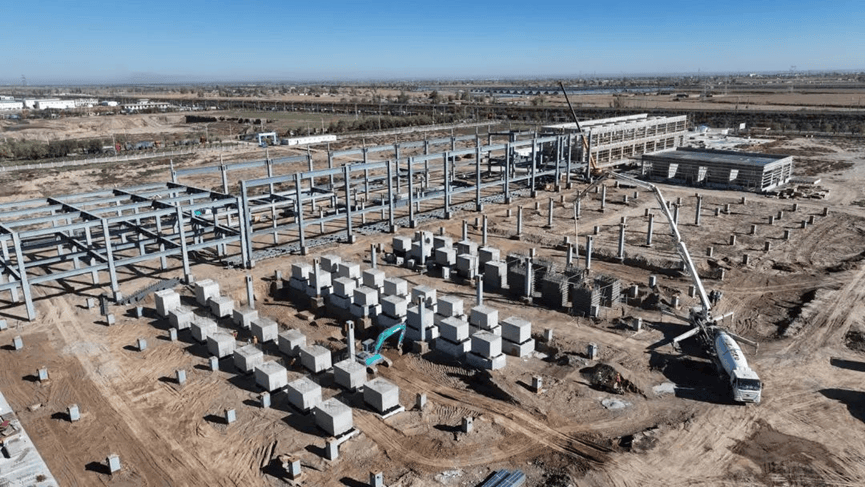 “目前我们项目已完成了化学品仓库、综合仓库的主体建设,循环水池、生产水池、消防水池主体也已完工。现在我们紧盯建设任务,进行厂房钢结构的安装以及设备基础的施工。接下来,我们计划十二月底完成厂房建设,有序推进施工进度。”甘肃潮讯志向新能源科技有限公司年产5GW单晶硅拉晶+5GW单晶硅切片项目负责人王志远说。