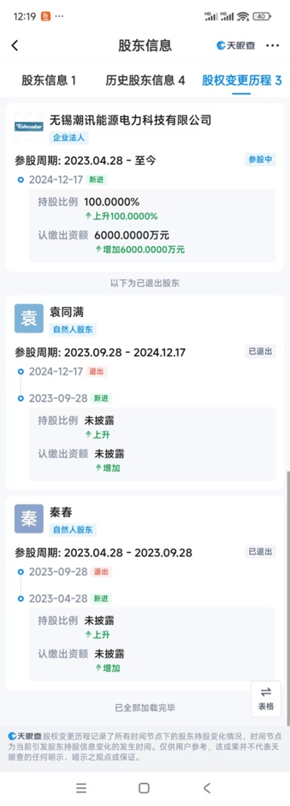 特别值得一提的是,甘肃潮讯股东竟然也完全变更了:其本是由江苏溙德与重庆睿哲投资成立,成立时江苏溙德持股比例为 85%、重庆睿哲持股比例为 15%;后江苏溙德、重庆睿哲将持有的甘肃潮讯股权全部转让给无锡潮讯能源电力科技有限公司(以下简称 “无锡潮讯”),并于 2024 年12 月17 日完成工商变更登记。
